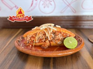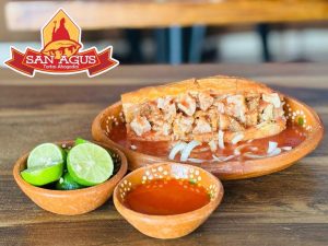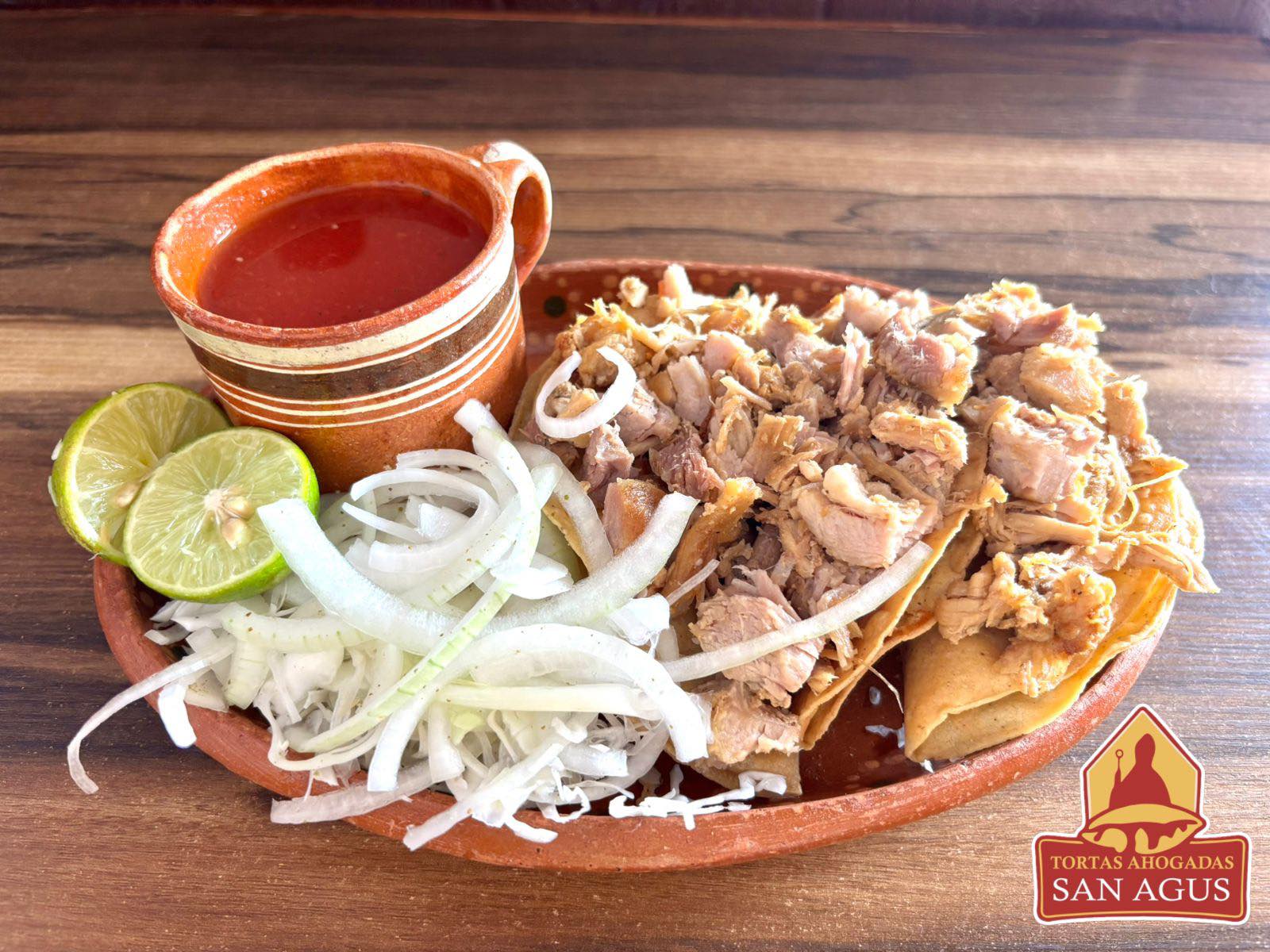 Delicioso birote salado, relleno de carnitas de cerdo con toque de frijoles y ahogada en salsa de jitomate, acompañada de crujientes tacos dorados.